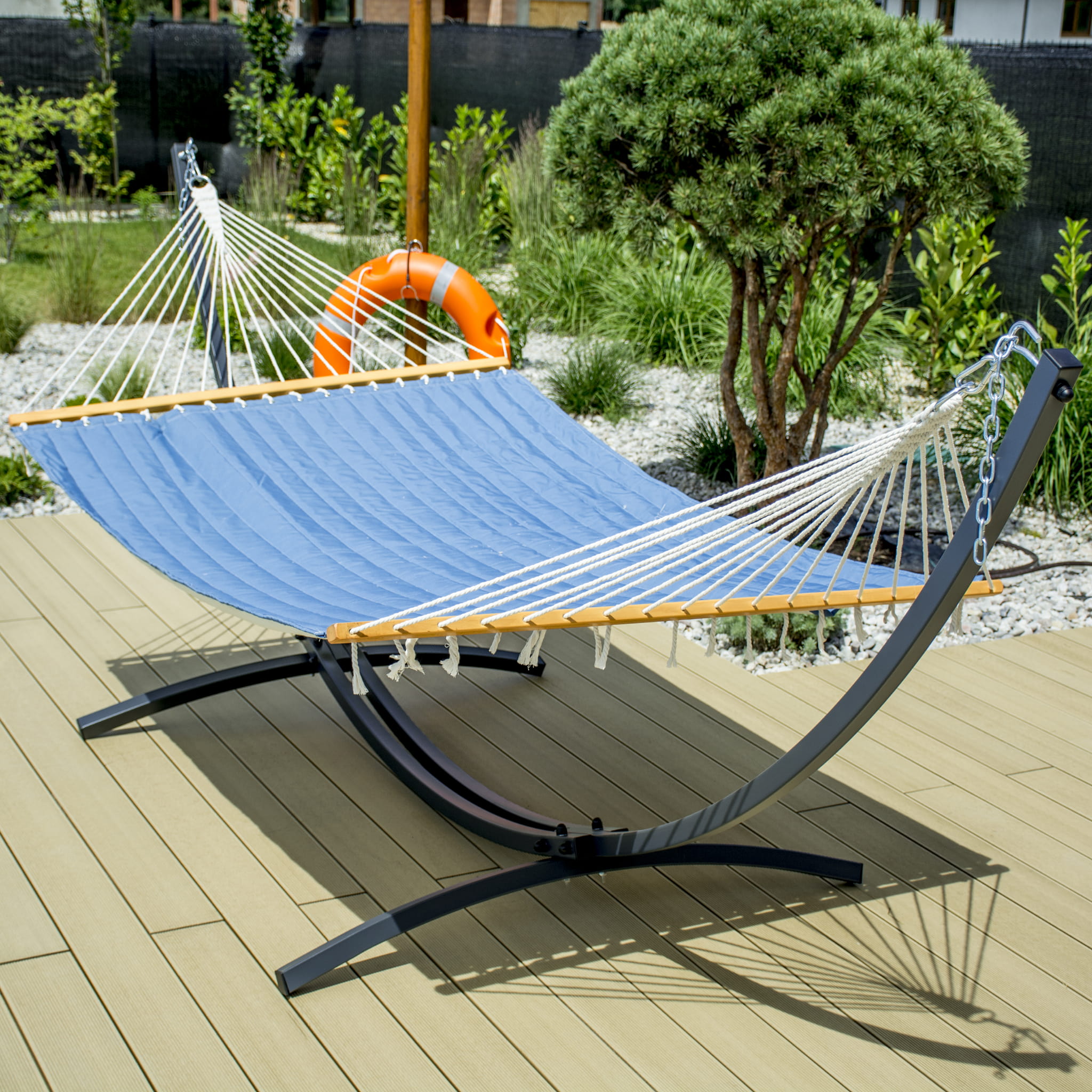 Dzięki unikalnej konstrukcji, nasz stelaż pasuje do wszystkich rodzajów hamaków – zarówno z poprzeczką, jak i bez. To Ty decydujesz, jak chcesz wypoczywać.
