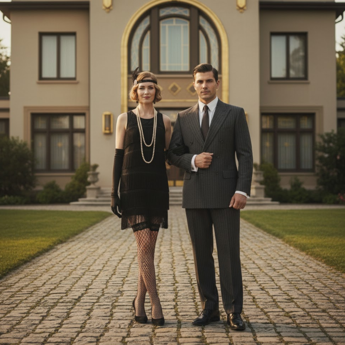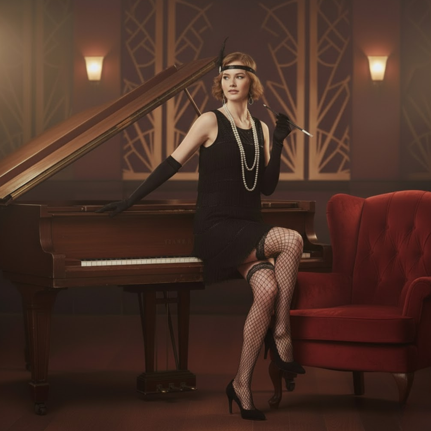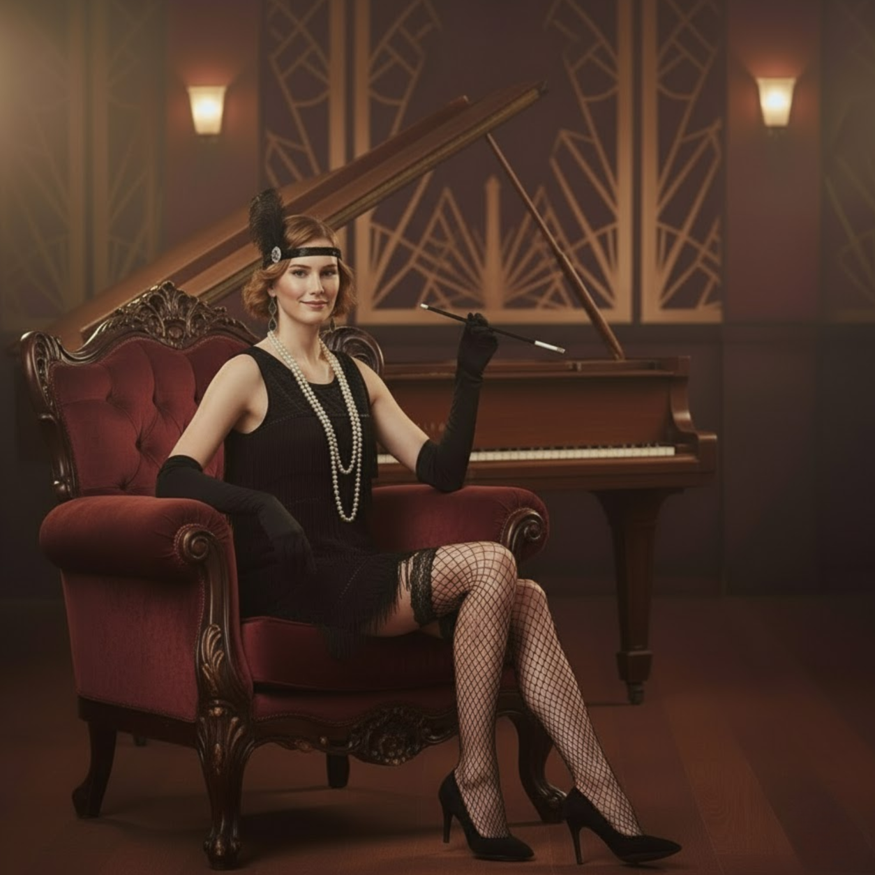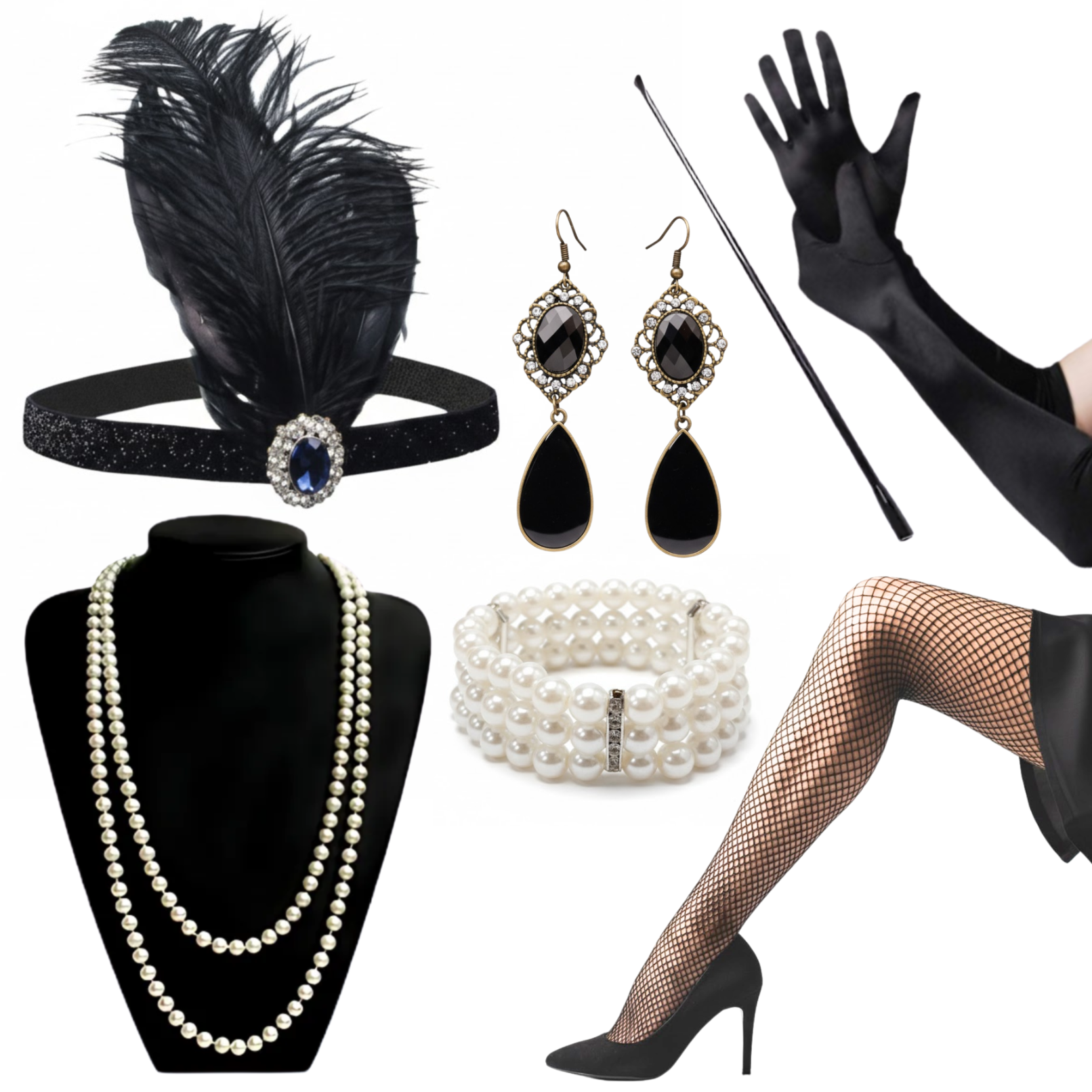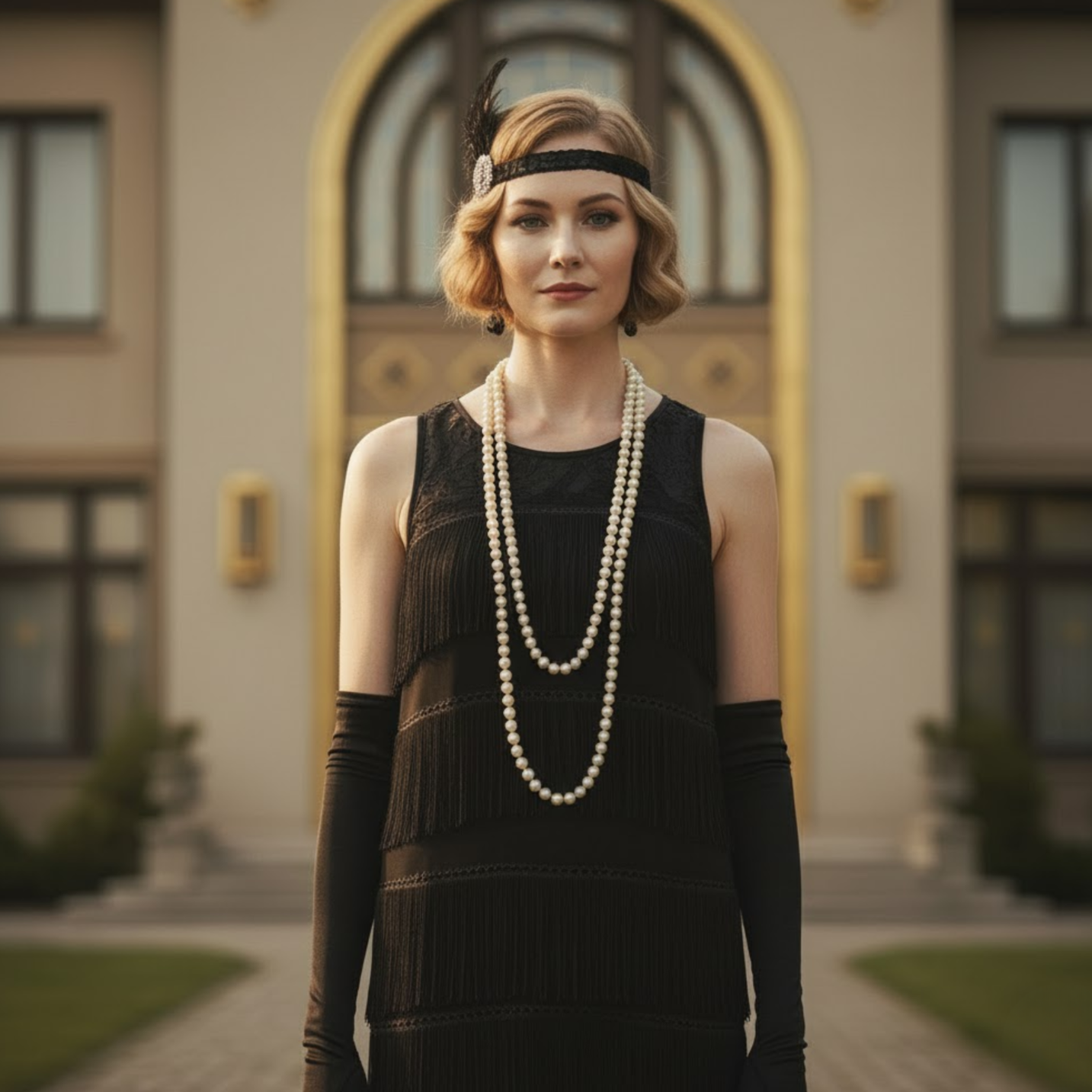 Lata 20. to czas luksusu, ekstrawagancji i niezależnych kobiet – teraz i Ty możesz wcielić się w ikonę tamtej epoki! Opaska z piórami i błyszczącą broszką dodaje charakteru i wprowadza atmosferę dawnych lat. Długie, czarne rękawiczki oraz kabaretki idealnie dopełniają stylizację, nadając jej elegancji i tajemniczości. Perłowy naszyjnik i bransoletka dodają klasycznej nuty, a wiszące kolczyki subtelnie podkreślają kobiecość. A żeby było jeszcze bardziej klimatycznie – uchwyt na papierosy w stylu filmowych diw!