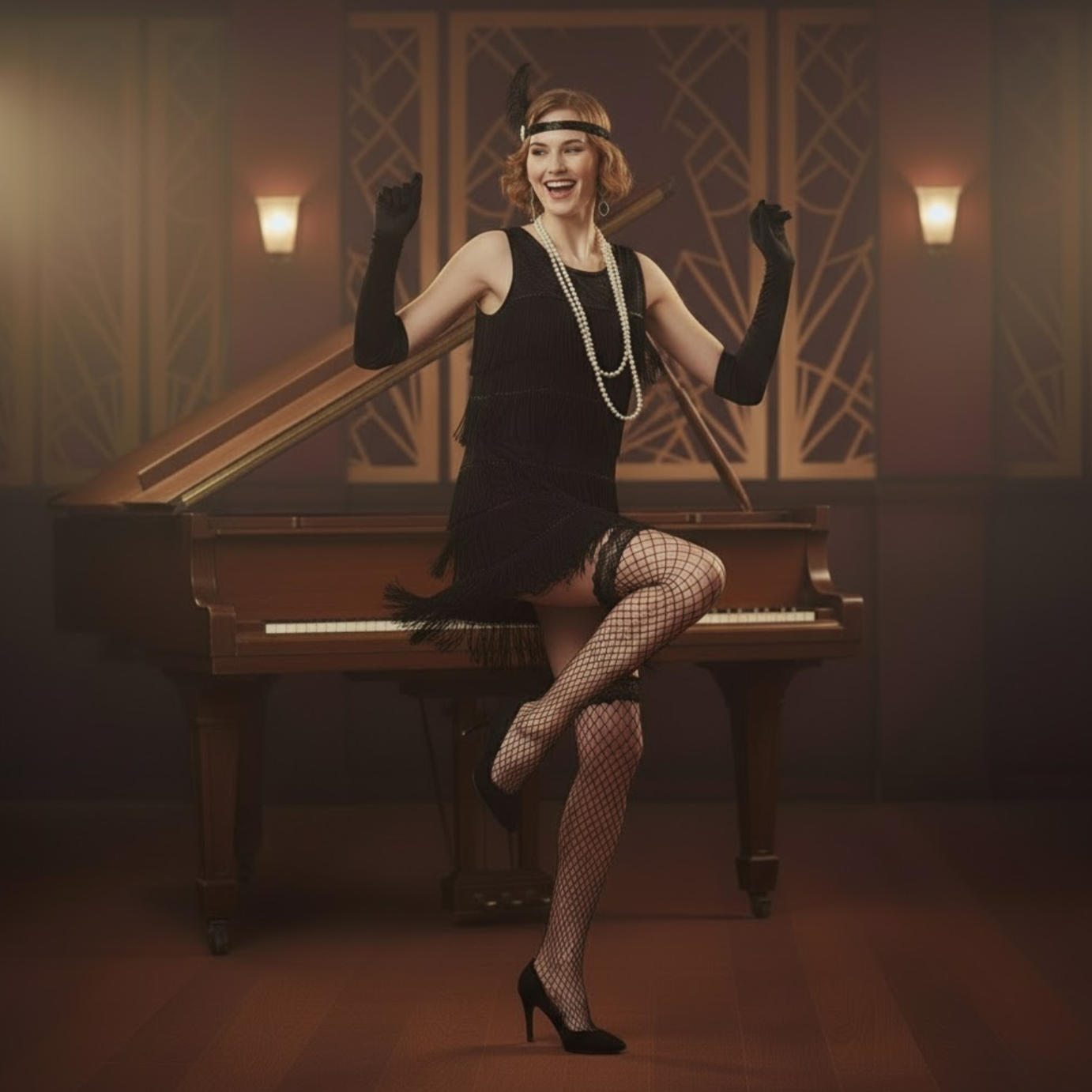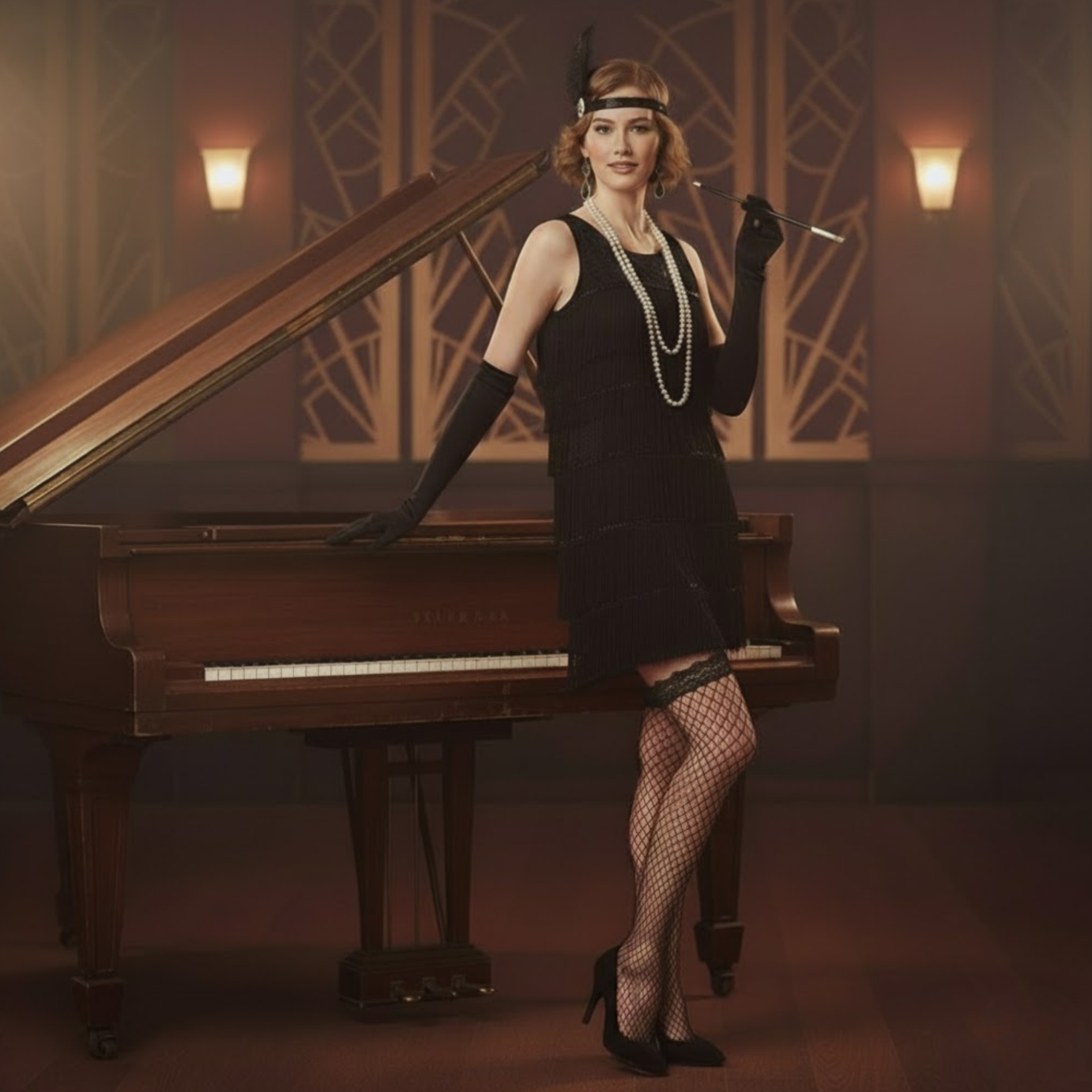Wejdź w świat elegancji lat 20. i poczuj się jak prawdziwa gwiazda kina! Ten zestaw to wszystko, czego potrzebujesz, aby zabłysnąć na imprezie tematycznej, balu karnawałowym czy wieczorze w stylu retro. Pełna klasy, zmysłowości i ponadczasowego szyku – oto Ty w nowym wydaniu. Dopasowane akcesoria podkreślą Twój look i sprawią, że wyróżnisz się w tłumie. Gotowa na podróż w czasie?