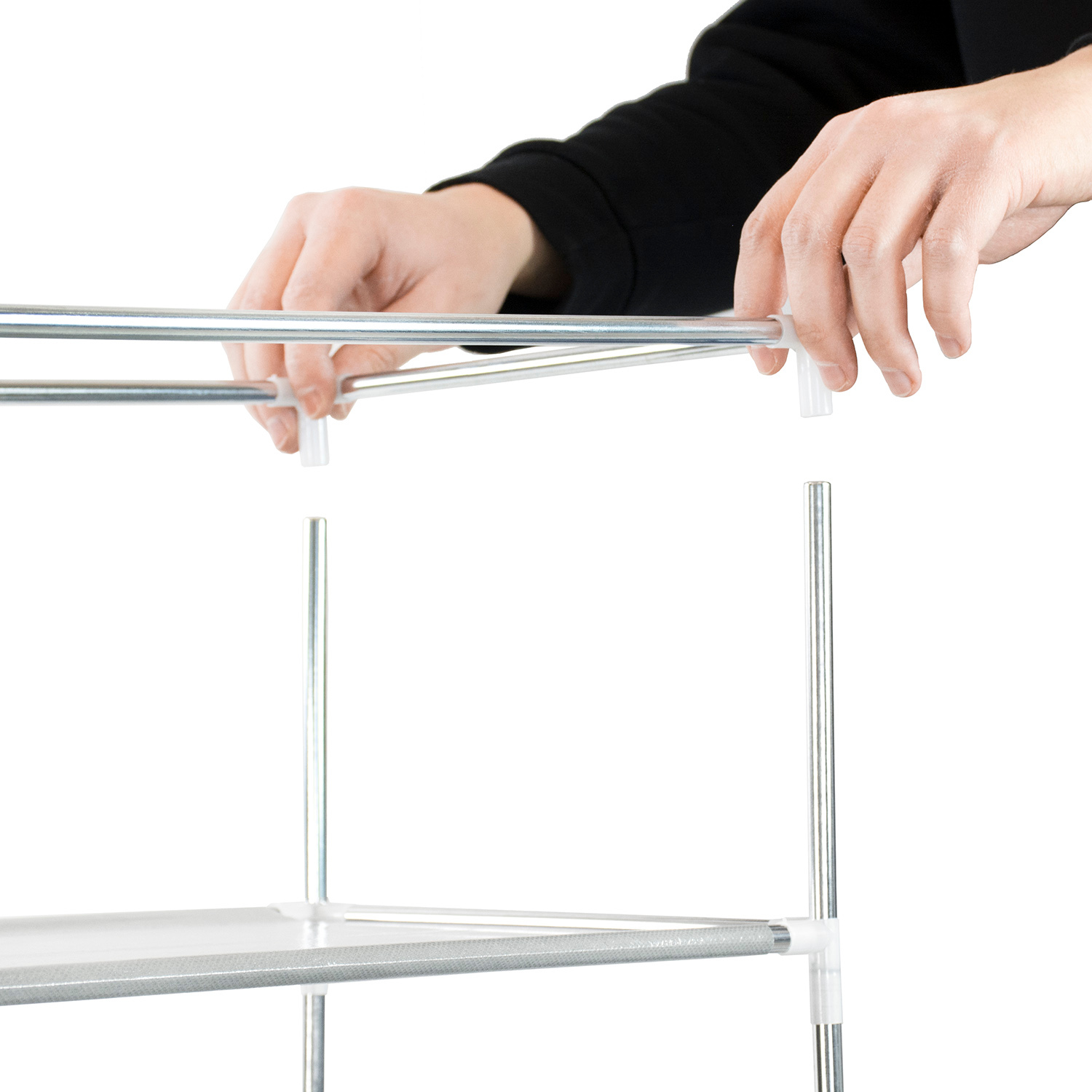 Dzięki zastosowaniu lekkich materiałów, takich jak metalowe rurki i półki z włókniny, przenoszenie szafki jest wyjątkowo proste. Produkt jest przeznaczony do samodzielnego montażu, a jego składanie zajmuje zaledwie kilka minut