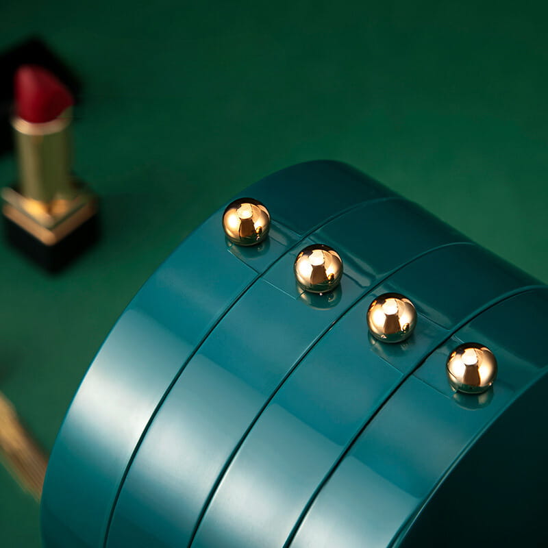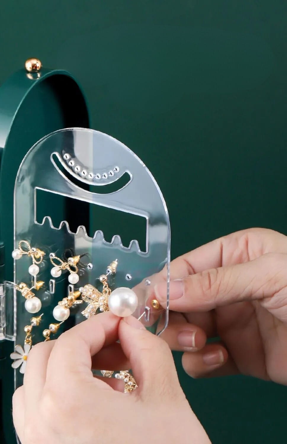 Nasza szkatułka to nie tylko elegancki dodatek, ale przede wszystkim praktyczne centrum organizacji. Z 153 dziurkami na kolczyki, 21 rowkami na naszyjniki i 3 rowkami w kształcie litery U, jest gotowa pomieścić każdy rodzaj biżuterii (pierścionki, kolczyki, bransoletki czy naszyjniki).
