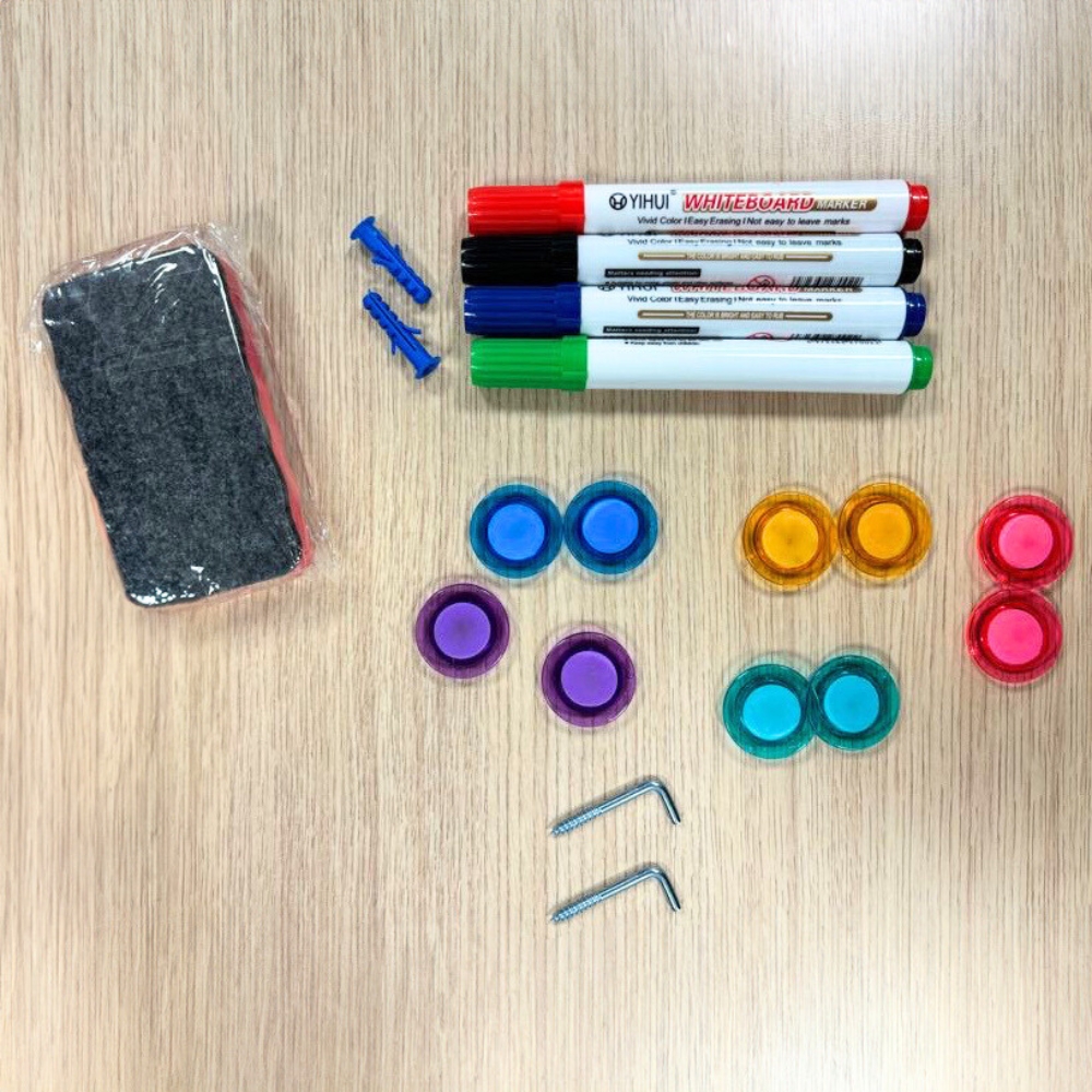 - pełny zestaw akcesoriów – w zestawie znajdziesz wszystko, czego potrzebujesz do komfortowego korzystania z tablicy: 10 kolorowych magnesów, 4 markery (czarny, niebieski, czerwony, zielony), gąbkę, półeczkę na akcesoria oraz niezbędne elementy do montażu (haczyki i kołki rozporowe).