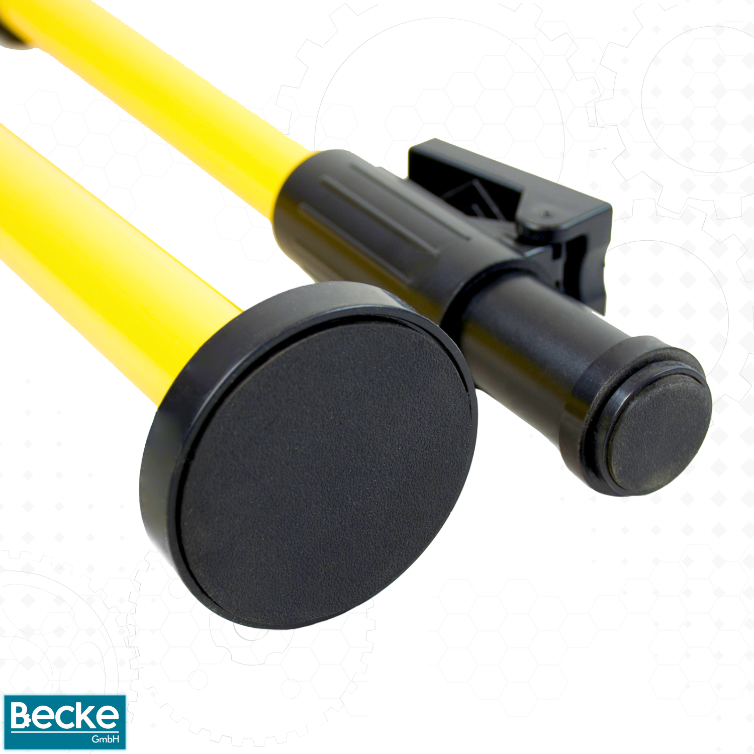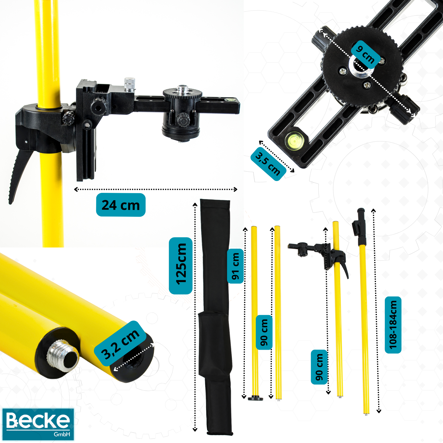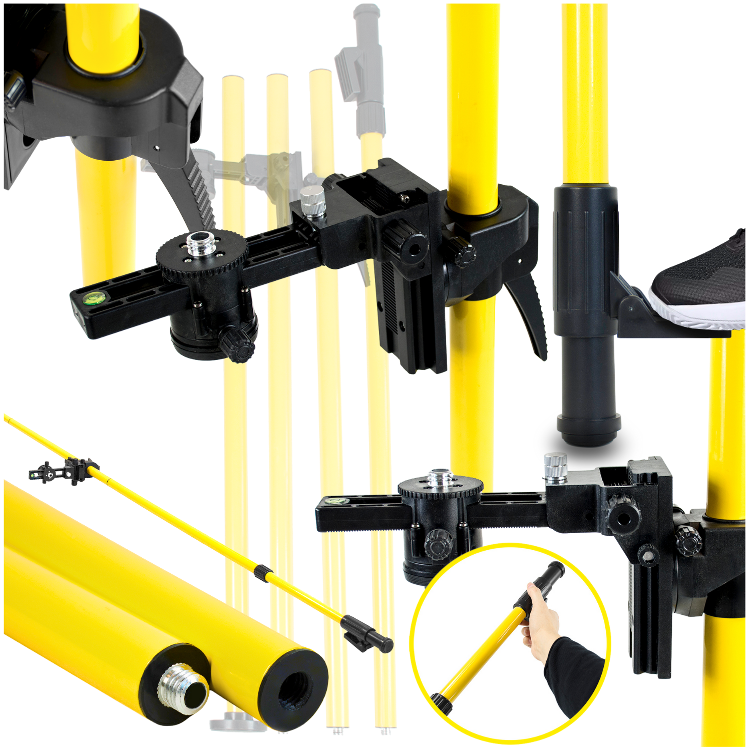Tyczka wykonana jest z lekkiego, ale bardzo wytrzymałego metalu, z elementami z odpornego tworzywa sztucznego. Szeroka podstawa i końcówka dociskowa pozwalają na mocne rozparcie między podłogą a sufitem, bez obawy o przesunięcie czy chwianie się lasera podczas pracy.