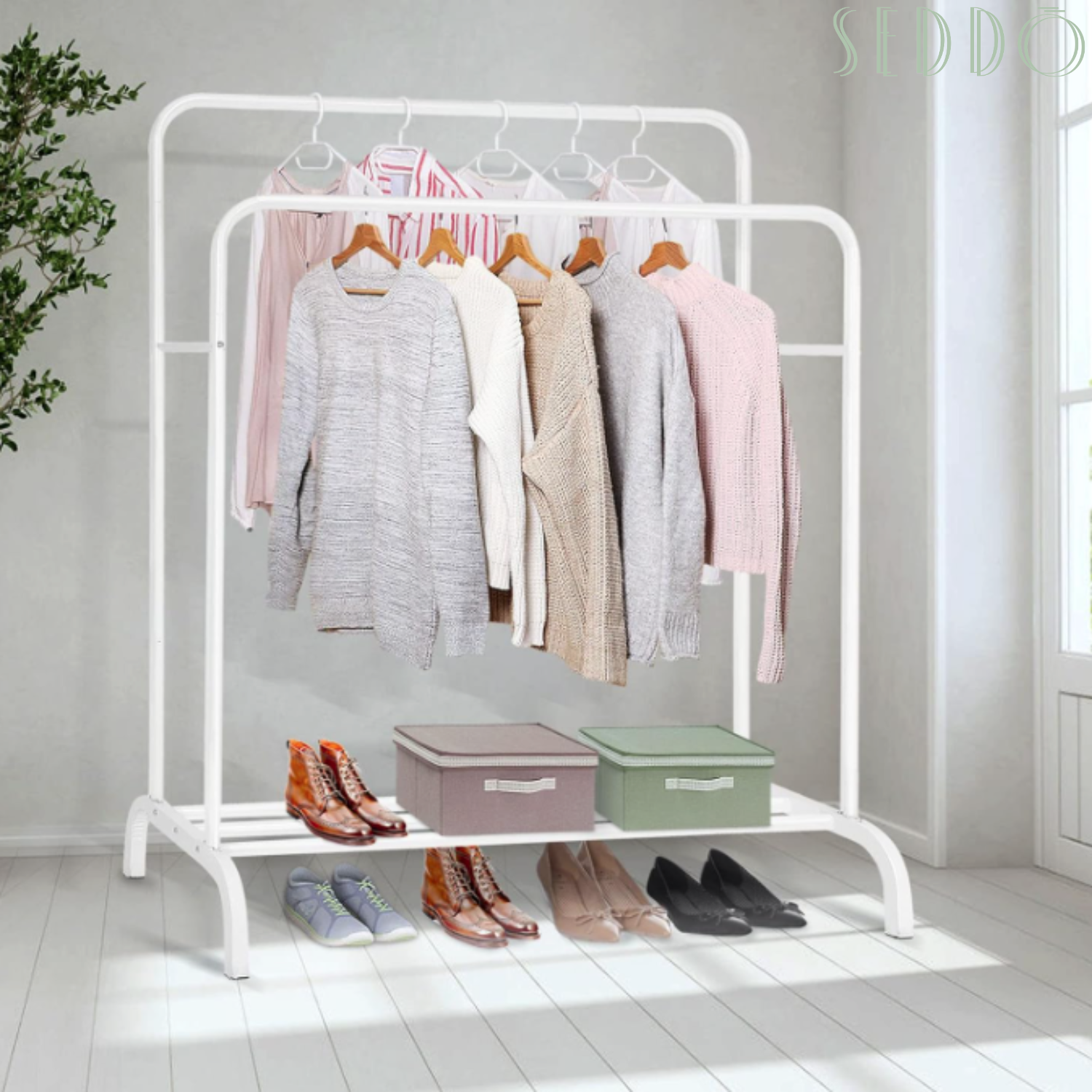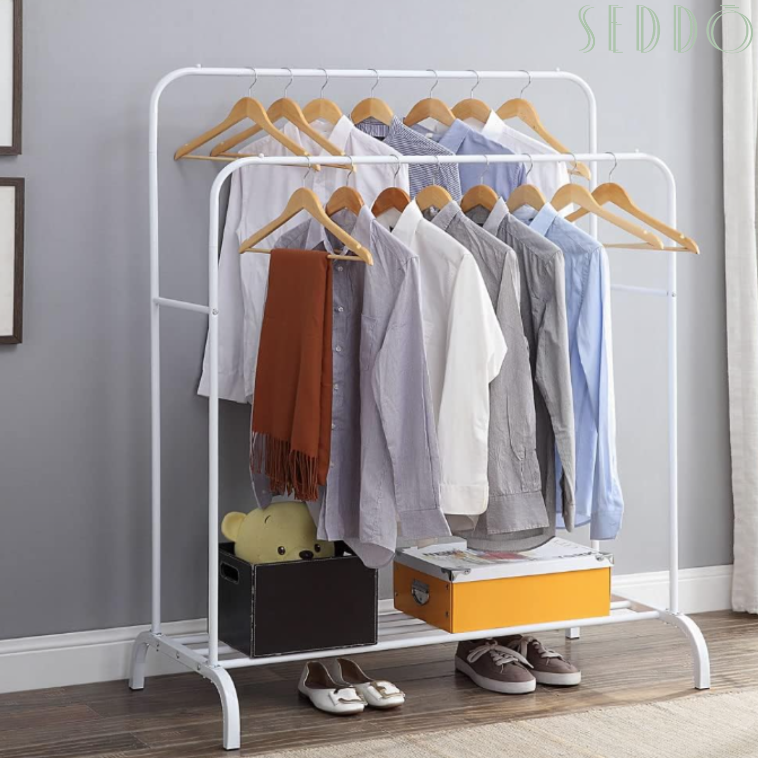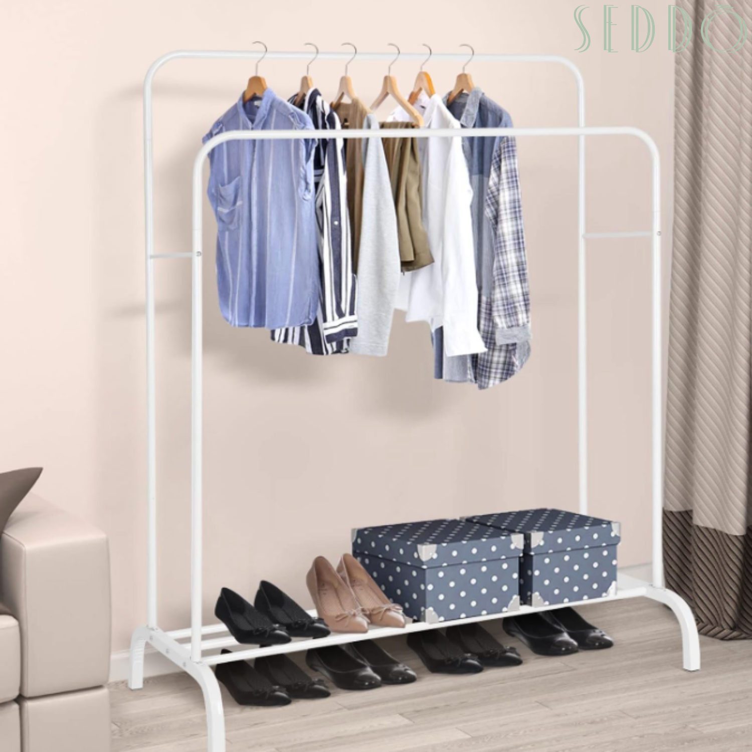 Świetnie sprawdzi się w garderobie – można na nim odwiesić ubrania, przygotować zestaw na kolejny dzień lub uporządkować dodatki. Dolna półka pomieści buty, pudełka lub kosze.