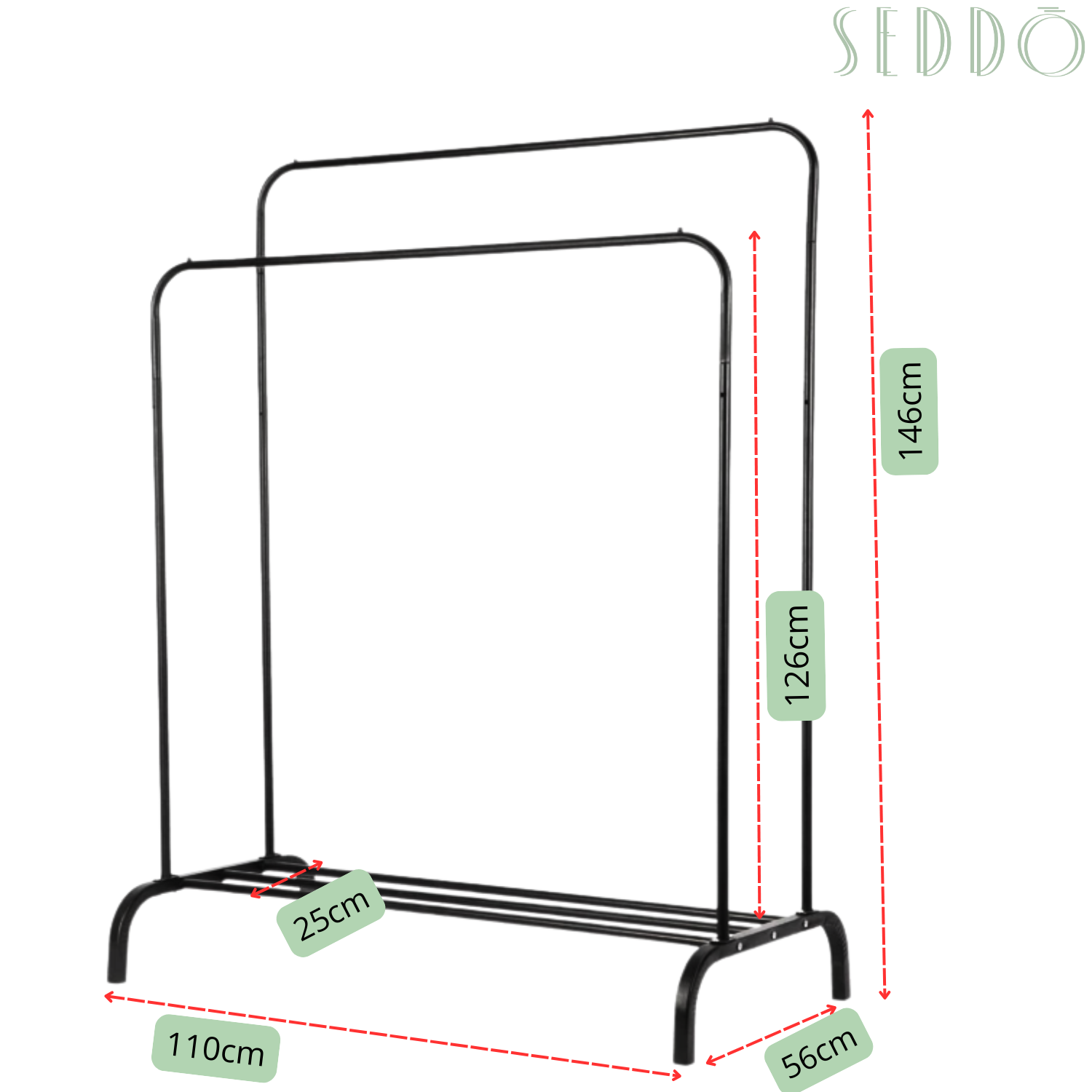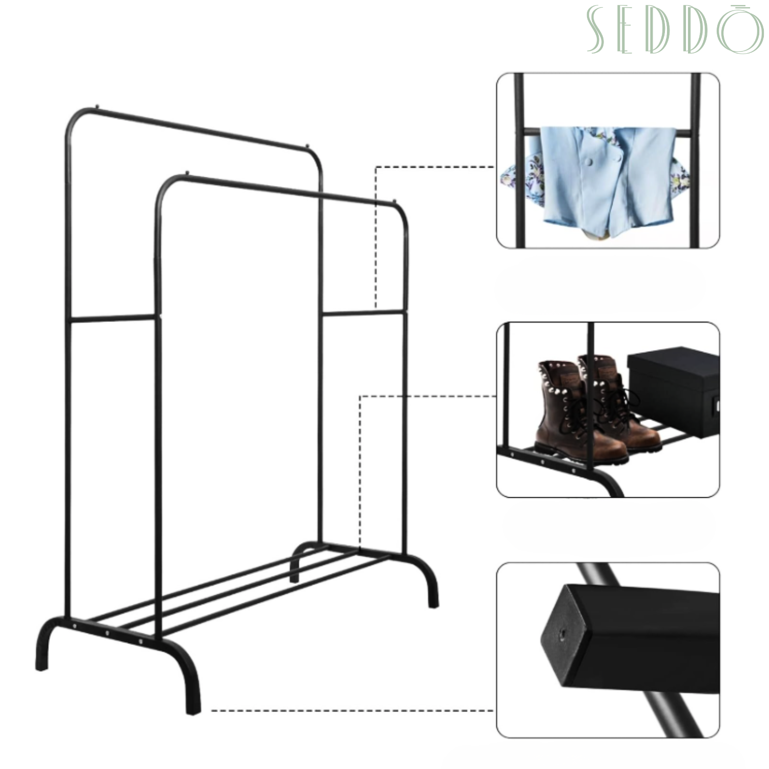 Ten stojący wieszak to połączenie prostoty i nowoczesnej elegancji. Metalowa konstrukcja w czarny, kolorze pasuje do każdego wnętrza i nie zajmuje dużo miejsca. Idealny do codziennego użytku.
