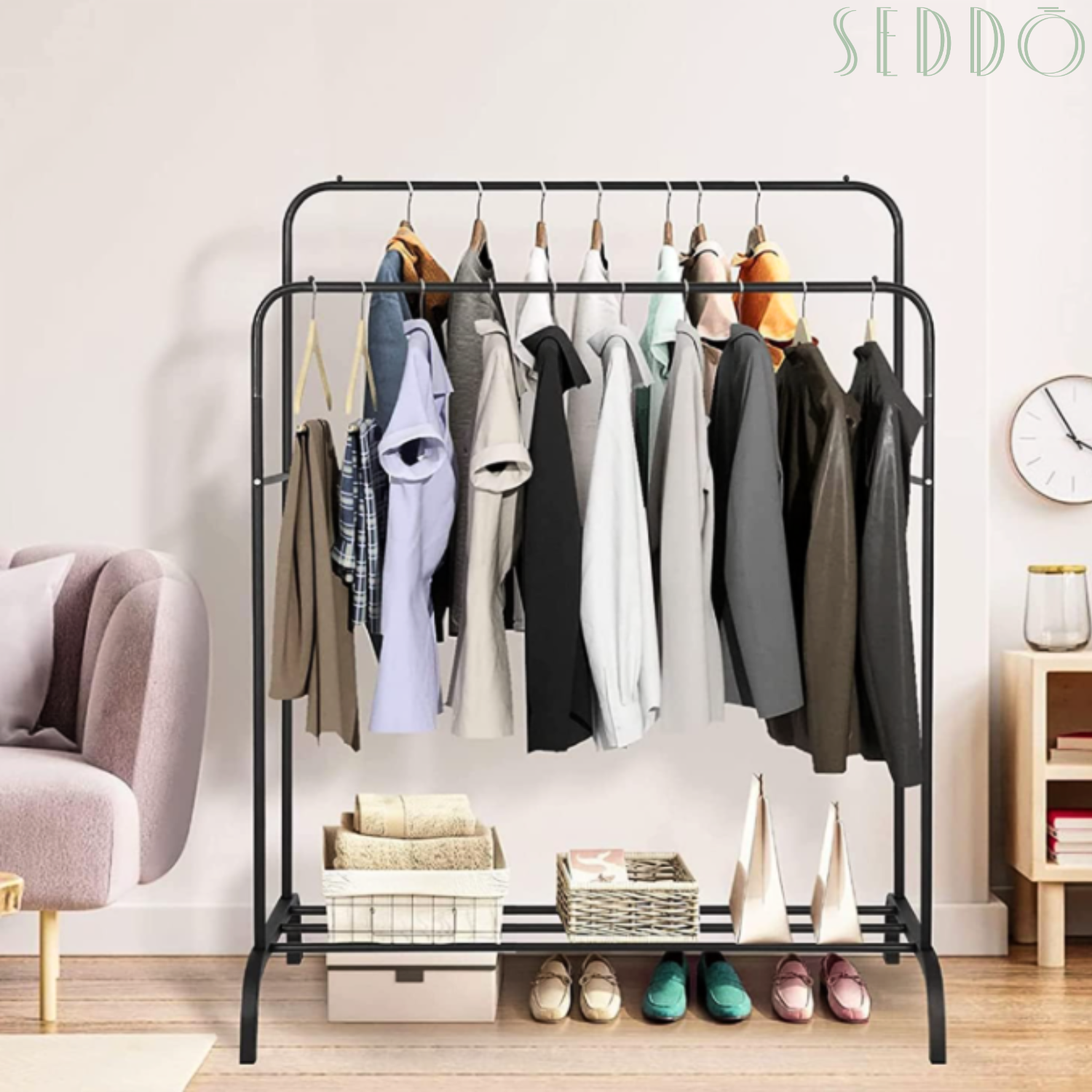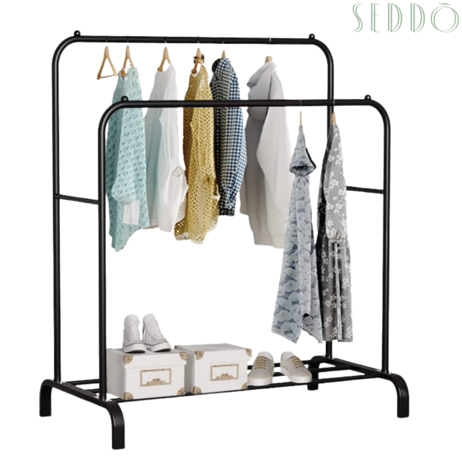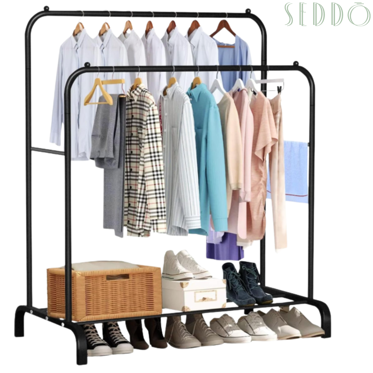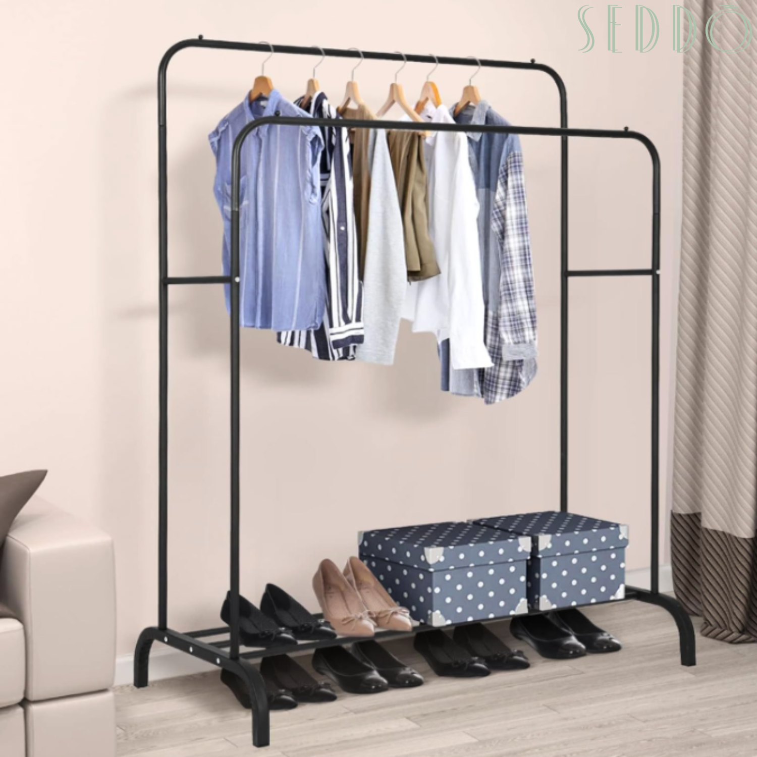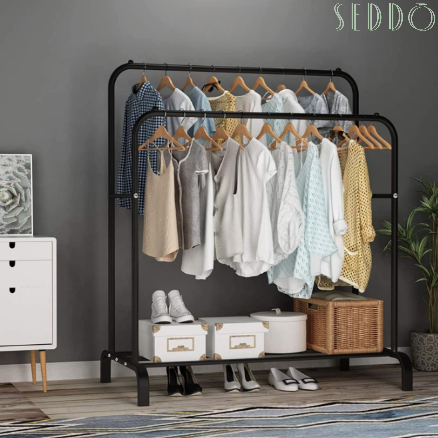 Świetnie sprawdzi się w garderobie – można na nim odwiesić ubrania, przygotować zestaw na kolejny dzień lub uporządkować dodatki. Dolna półka pomieści buty, pudełka lub kosze.