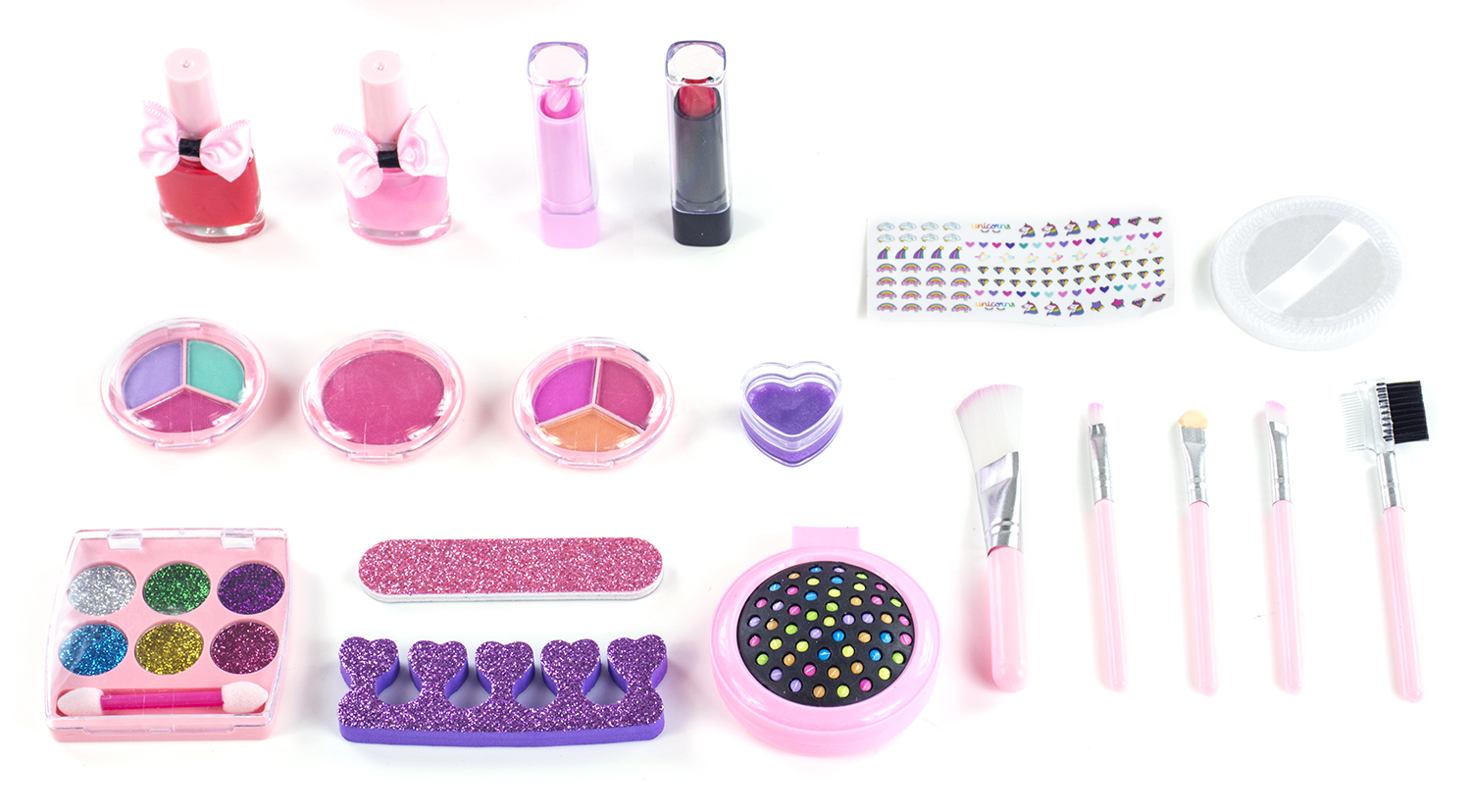 ✅ Aż 20 elementów – komplet akcesoriów do makijażu, w tym cienie do powiek, błyszczyki, pędzelki, róże i lakiery do paznokci.