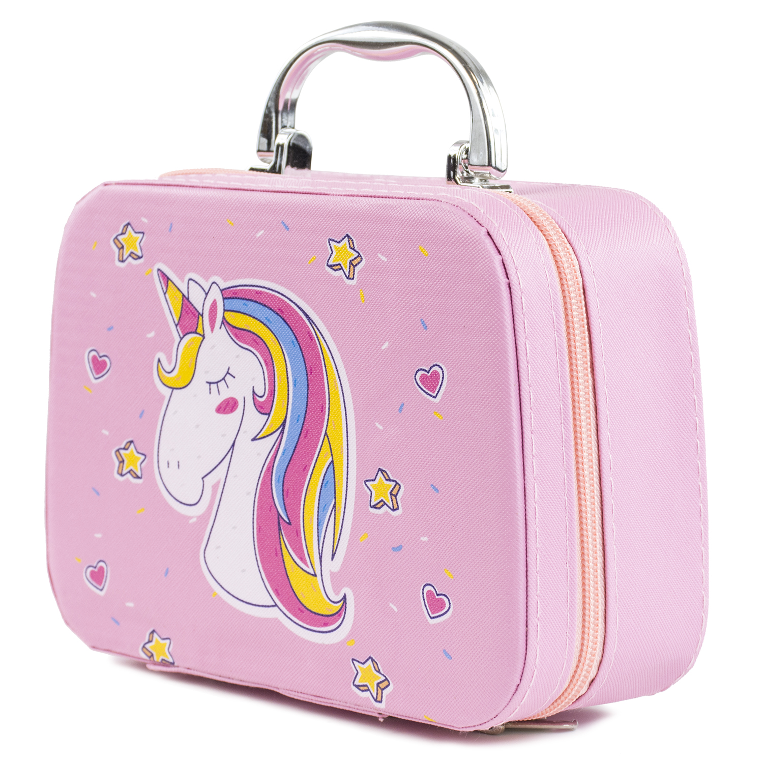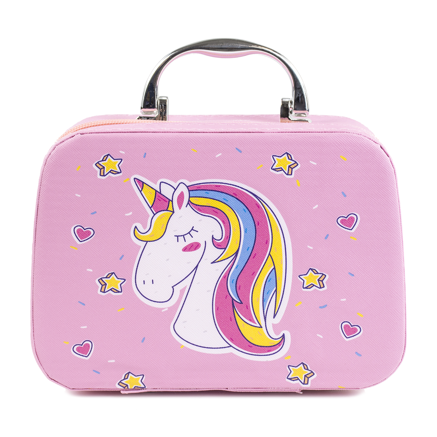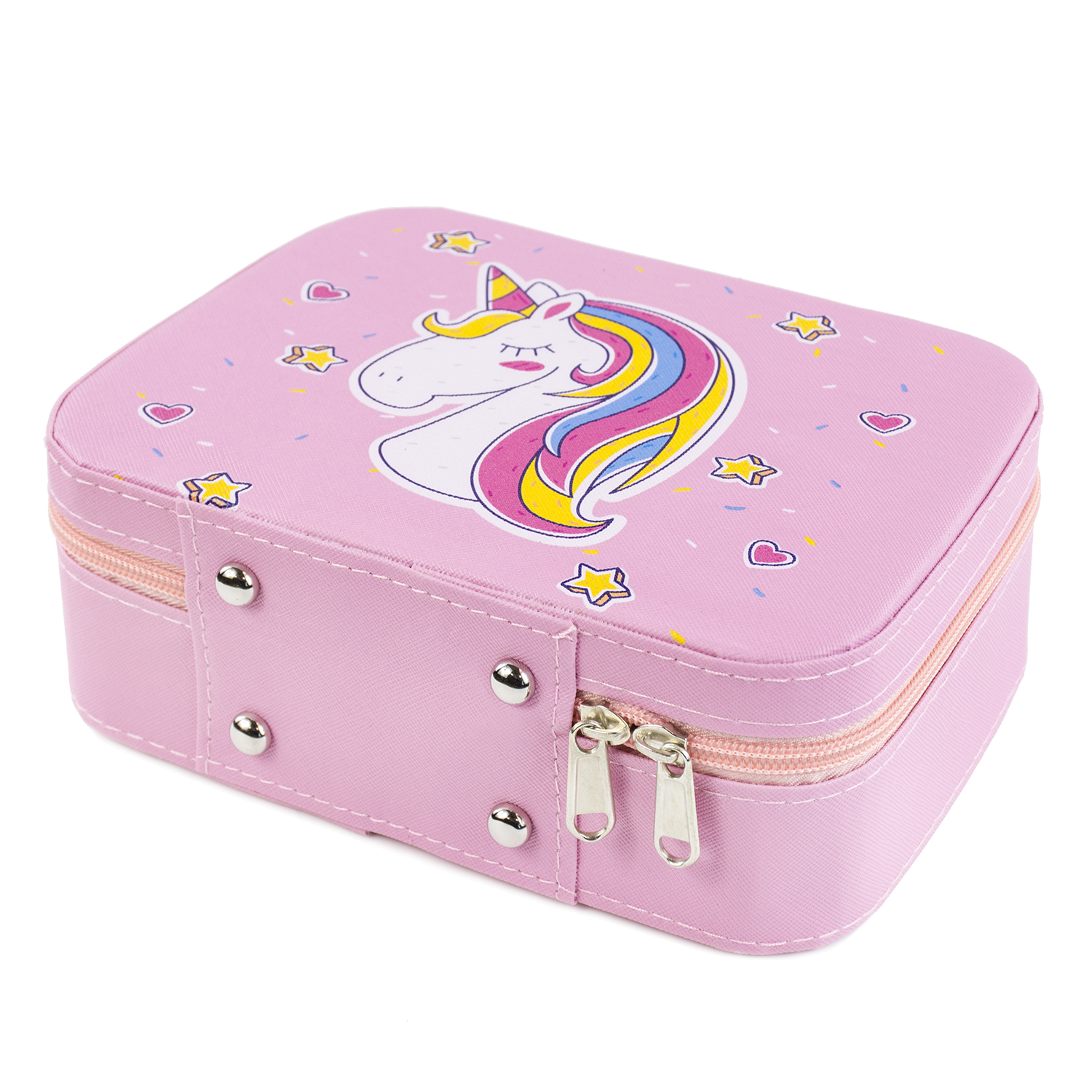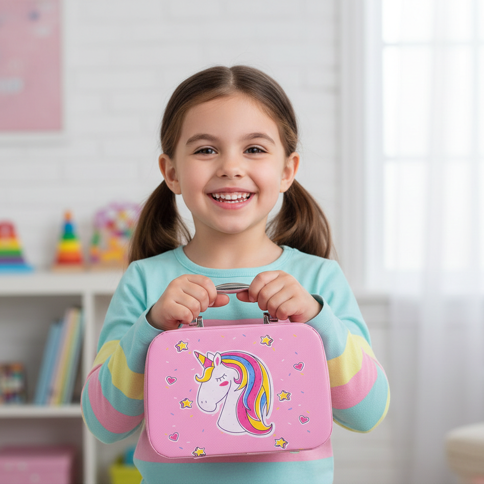 ✅ Praktyczny design – różowy kuferek z motywem jednorożca, który może służyć również jako torebka.