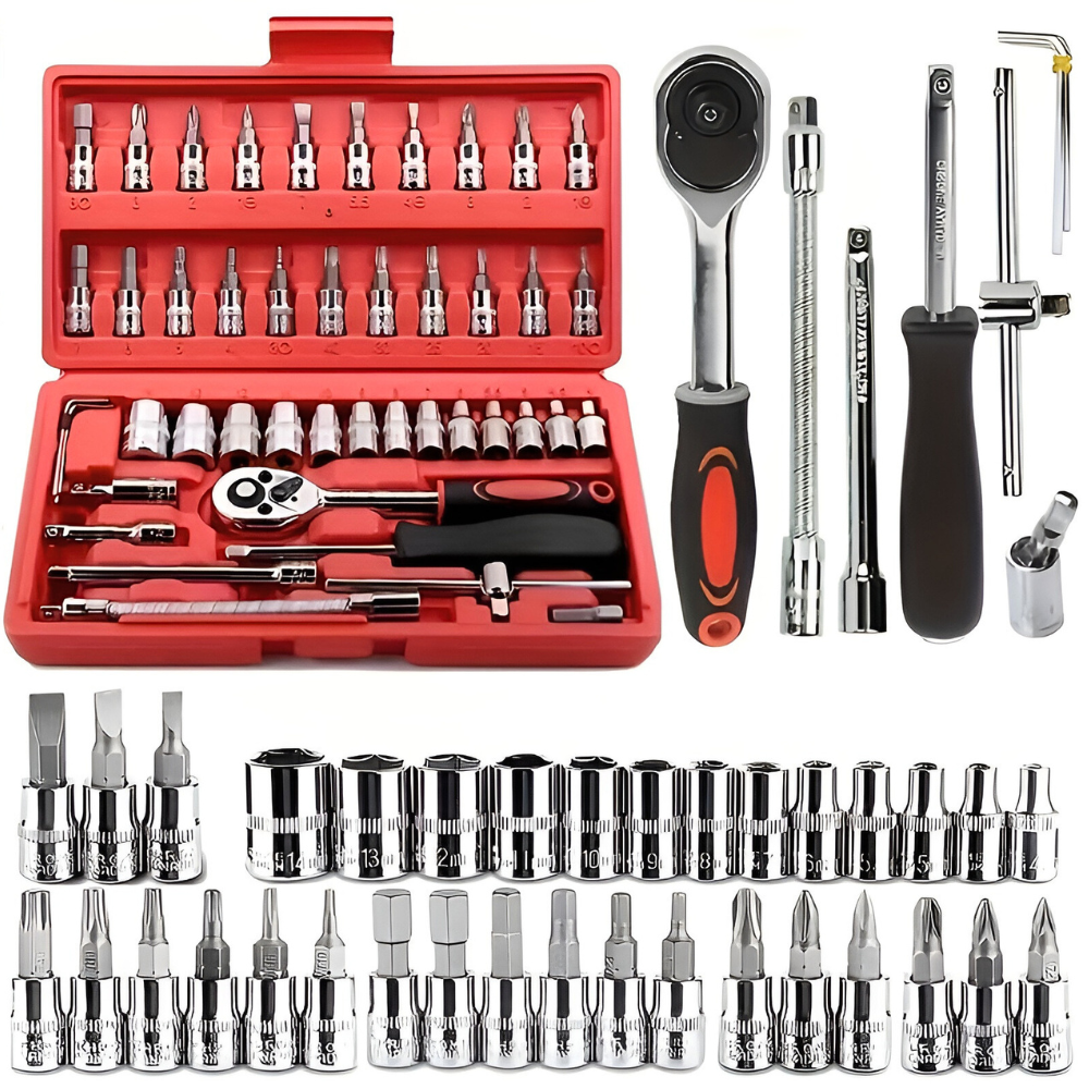 Zawiera 46 różnorodnych elementów, dzięki którym poradzisz sobie z naprawami, montażem i projektami DIY — bez szukania dodatkowych narzędzi.