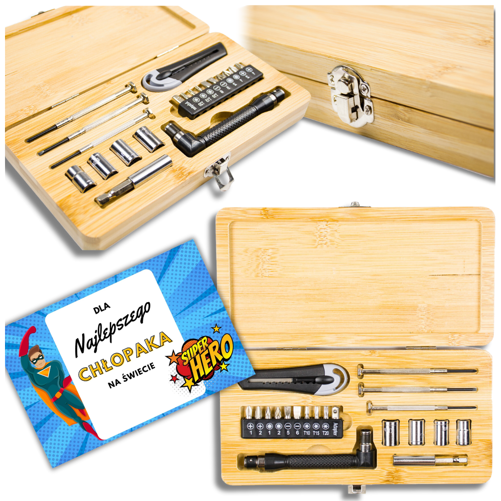 Zestaw narzędzi w drewnianym kuferku na prezent
