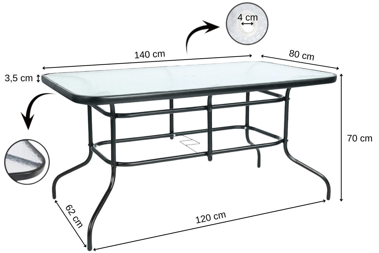 Blat o wymiarach 140 × 80 cm zapewnia wystarczająco dużo miejsca dla 4-6 osób tworząc komfortowe warunki do spożywania posiłków na świeżym powietrzu. Idealne miejsce na rodzinne śniadania, obiady, czy też wieczorne spotkania przy zachodzącym słońcu!